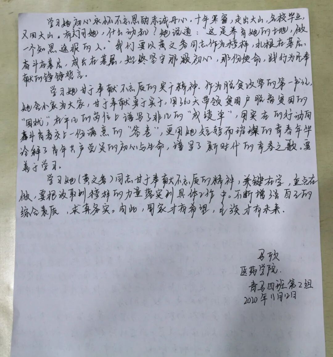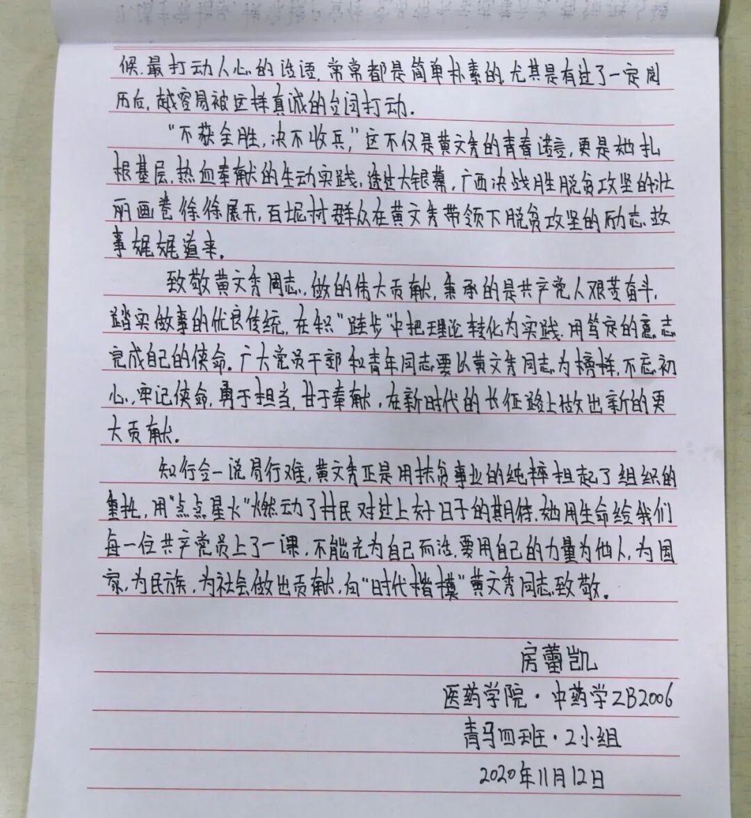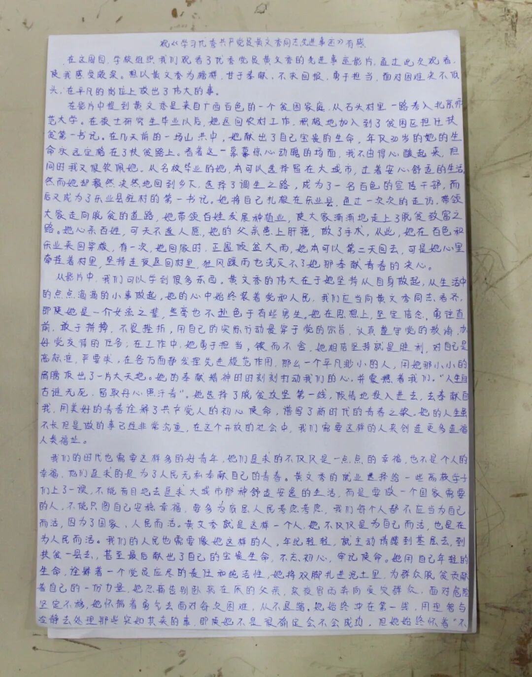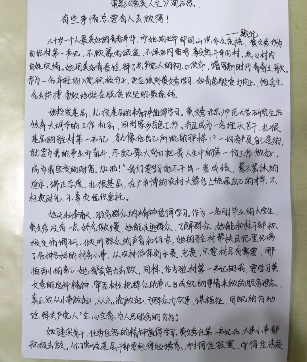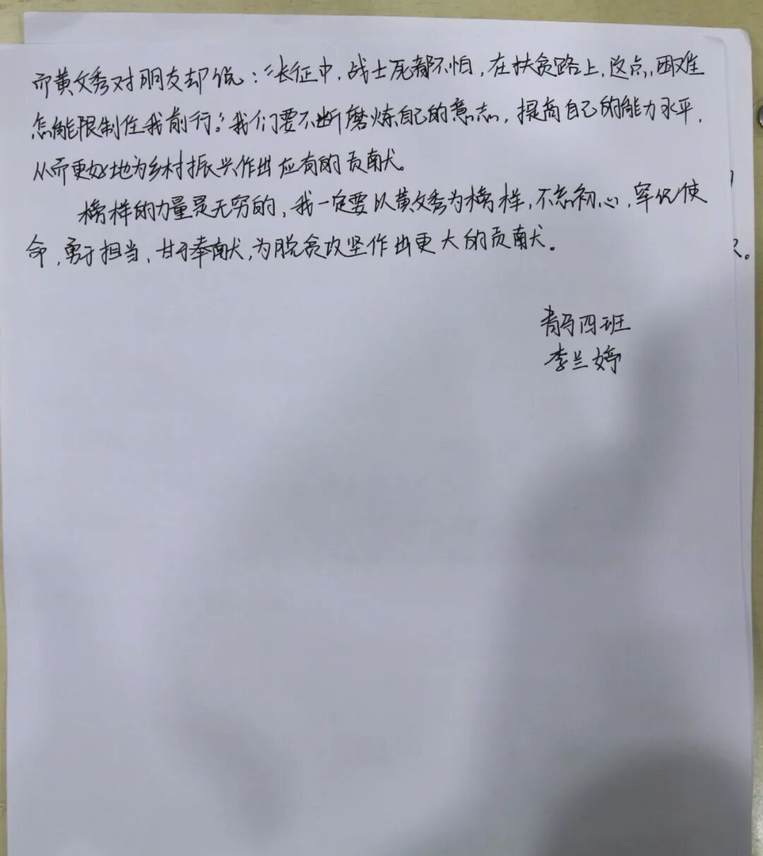 一个30岁的研究生,一个年轻的第一书记,把年青沸腾的热血撒在脱贫攻坚的路上。在黄文秀心中的长征就是在百坭村驻村一年行驶了两万五千公里。在这里的每个贫困户的背后都有一个沉重的故事,让农村出来的她感同身受,她把她的故事也讲给村民听,拉进她们彼此之间的距离,更好的开展脱贫工作。她说“登山的人身上都有一根绳子,前面的人连着后面的人,而我身上也有一根绳子,前面的人拽着我,我也要拽着后面的人”,她一心为人民,她把扶贫路当做长征路,对驻村工作全力投入,尽心尽力,使得全村贫困率下降20%以上。2019年6月17日凌晨,她在从百色返回乐业途中遭遇山洪不幸遇难,献出了年仅30岁的宝贵生命,谱写了一曲时代的青春之歌。