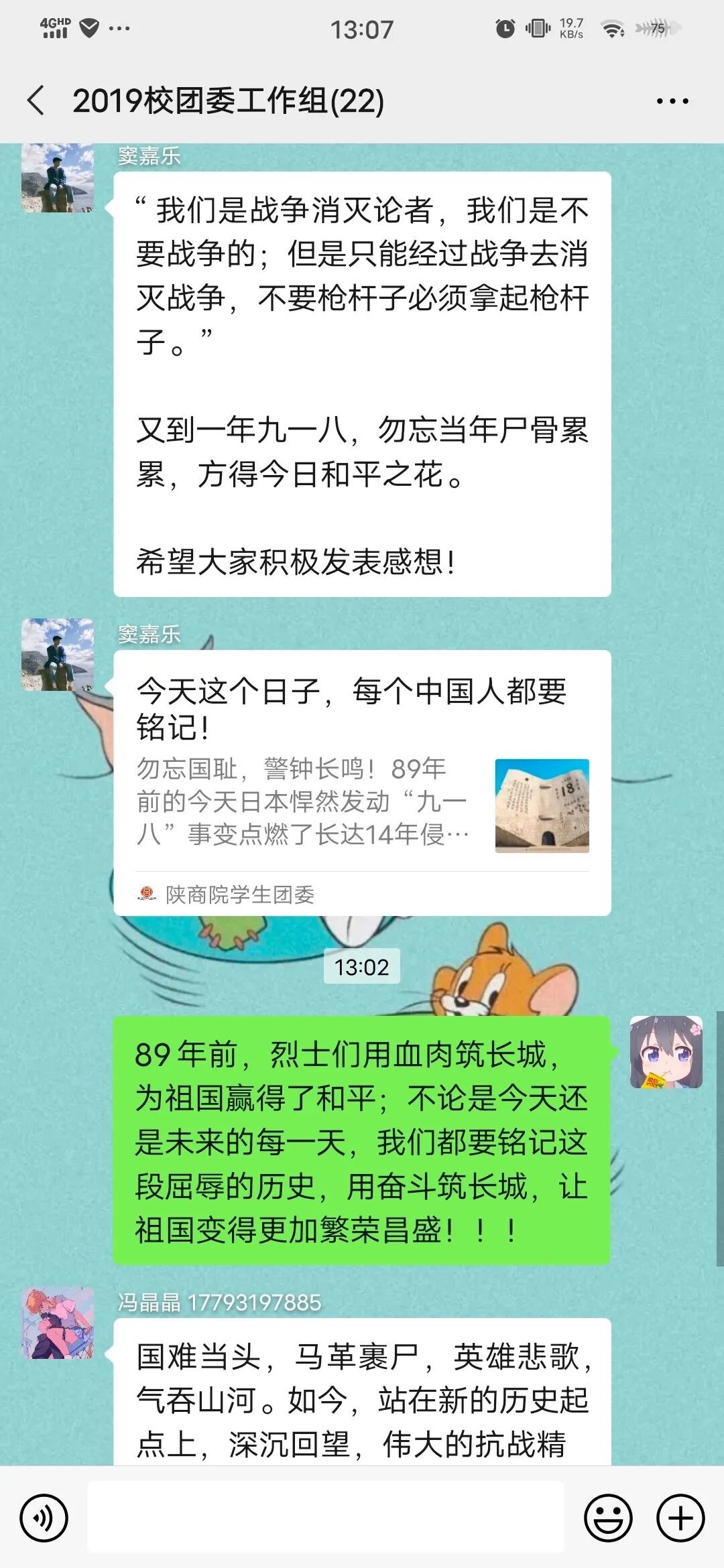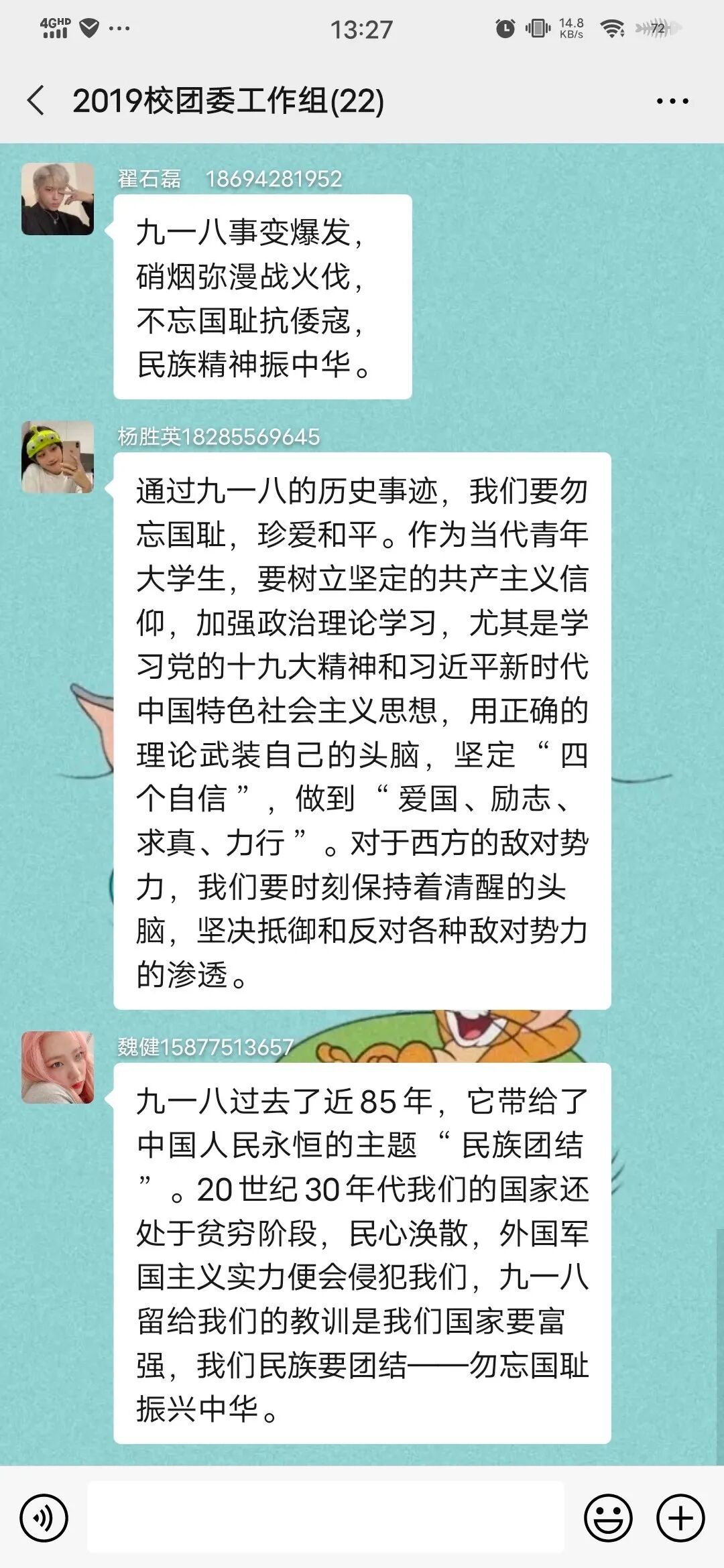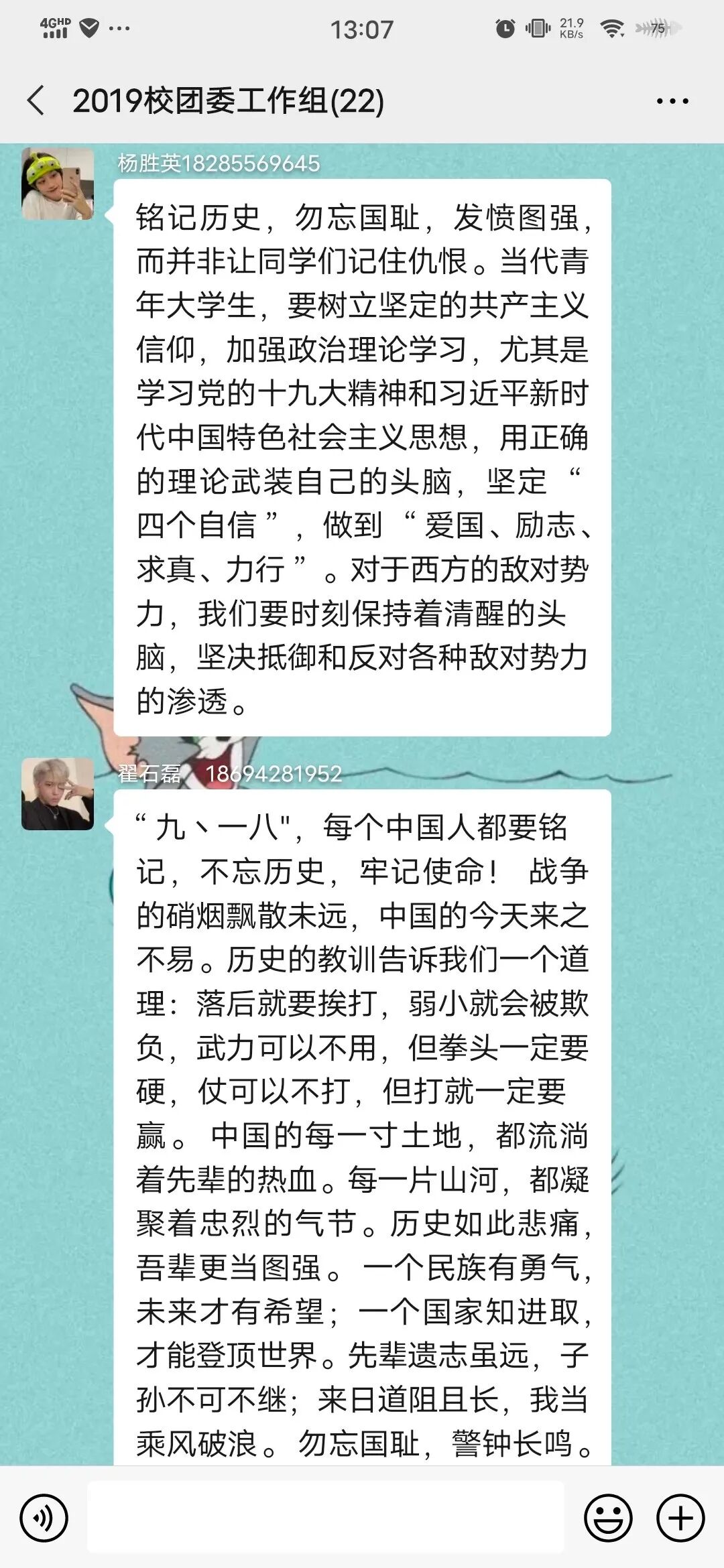 校团委信息部部长窦嘉乐利用ppt带领大二委员们回顾了这段刻骨铭心的历史,学习了先辈们爱国不屈的精神,并通过微信交流了想法和心声,抒发了自己的爱国情怀。